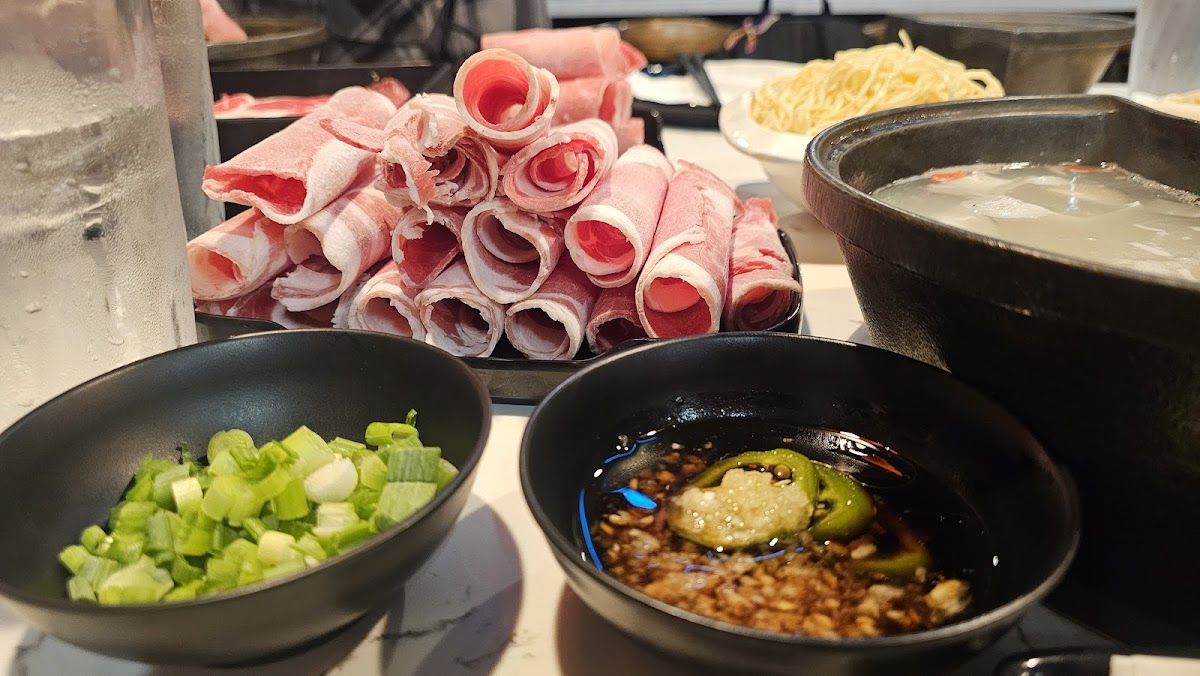 I loved the idea of this spot, individual pots, a good variety of soup bases, the option to do personal half hotpot half barbecue. Got a corner sauce bar with options like fermented tofu too. Topping variety is decent, got biang biang noodles, shrimp paste, a whole column of veggies. And if you care for dimsum or appetizers, they have those options too. I went with the cilantro and preserved egg base. got a few pieces of it in the soup. The flavors aren't too strong, they do have extra cilantro at the sauce bar if I really wanted to amp it up. I went with mainly their beef tongue, pork belly, ribeye, only to find that they do have lamb (my favorite) but was a bit too full for it. Veggies were quite fresh, I would say about half a bunch is given in each order. The portions per order are quite small, which helps prevent over ordering, sort of... my stomach felt full after I sent in the last order. I really want to love this place but doubt I want to come back. The original soup was just right, but when your soup is running low and you get soup refills, their broth is quite salty. I don't recall the last time I needed to drink this much water during hot pot. I had to stop dipping my food in the sauce too just to limit the sodium intake. It was still too late though, I had a fat headache for the rest of the day. If your stomach is as sensitive as mine with salt and MSG, beware. My other friend was also not feeling too well after the meal due to the salt. If your kidney works wonders, go for it.